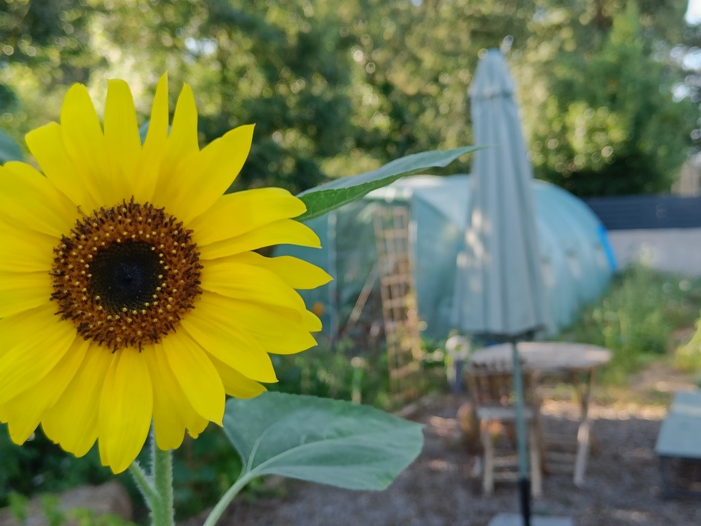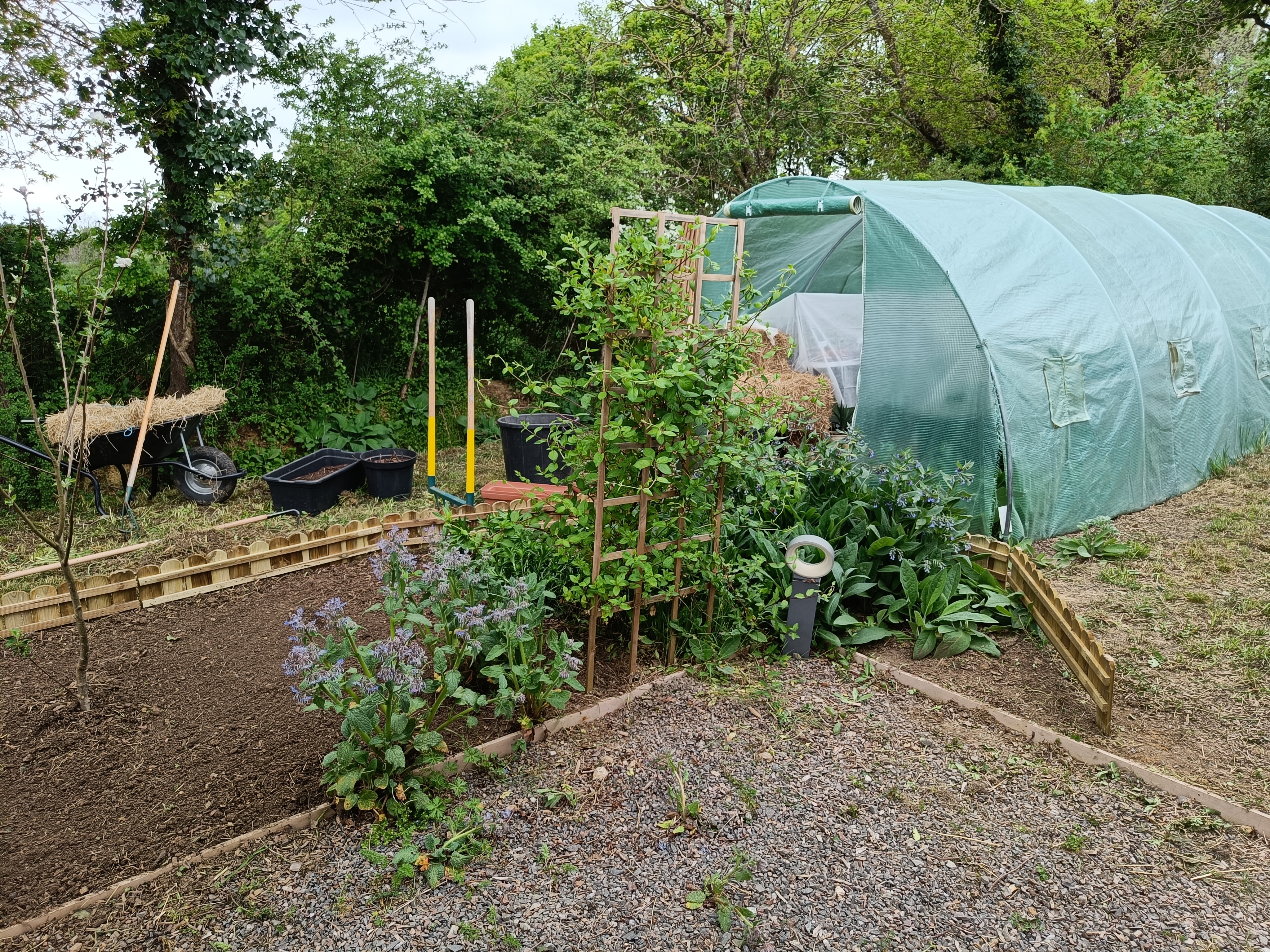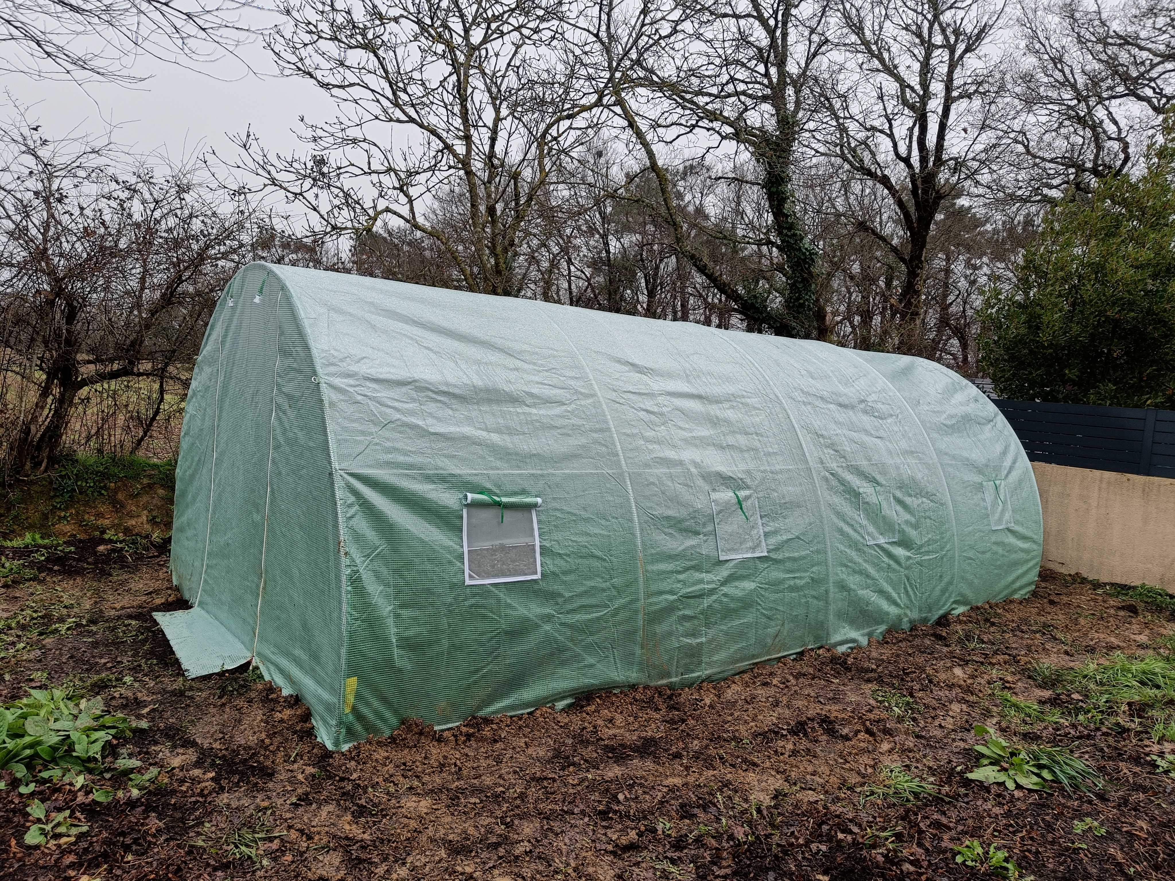 Après ce premier été, je profite de mon espace pour poser une serre bas de gamme afin de me familiariser avec cet outil exigent. L’exposition sud-ouest du terrain permet au soleil d’atteindre les cultures et la serre du milieu de matinée jusqu’au au milieu d’après-midi. Malheureusement, la haie végétale qui borde le champs jouxtant mon terrain bloque le soleil de milieu/fin d’après-midi.